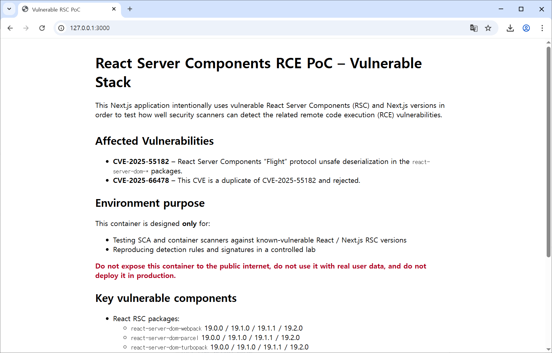 docker run --rm -p 127.0.0.1:3000:3000 ghcr.io/l4rm4nd/cve-2025-55182:latest