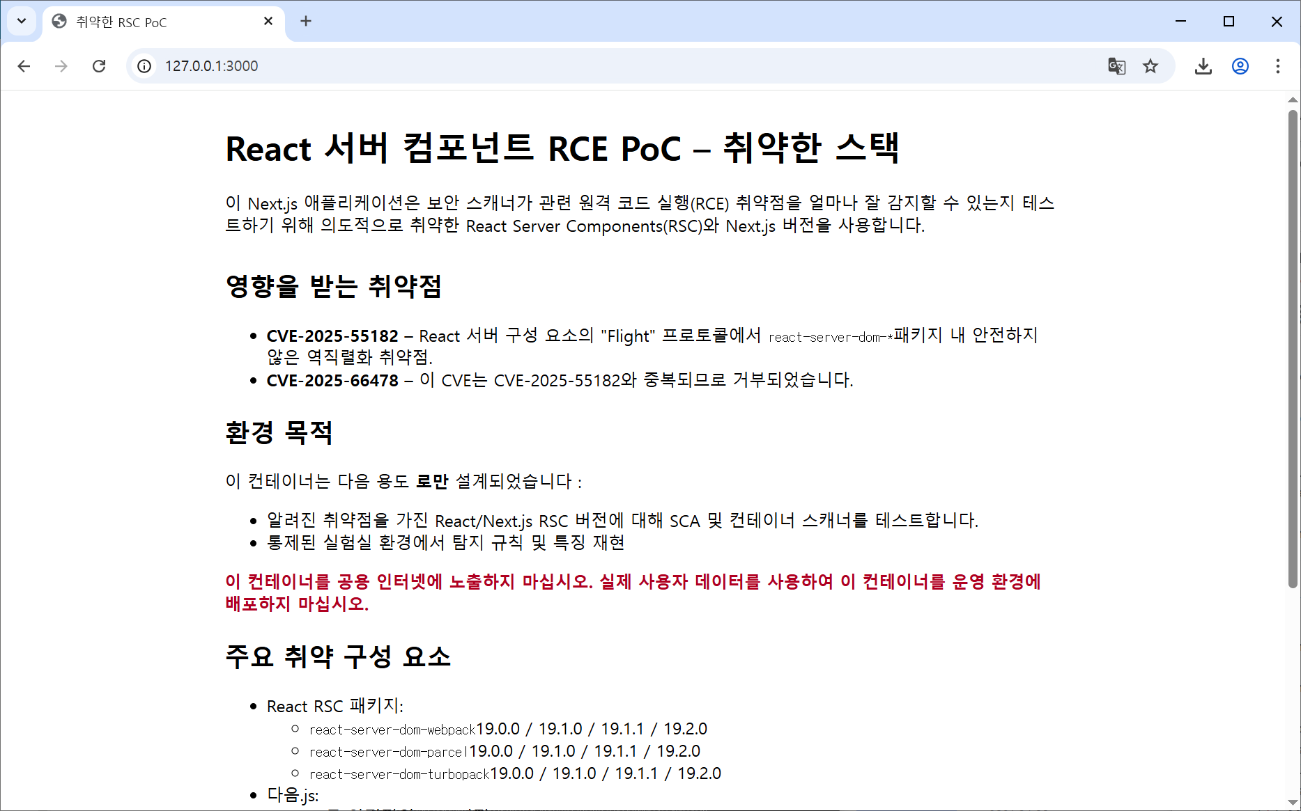 ◎ CVE 테스트 환경을 제공하는 깃허브 페이지를 확인한다. (https://github.com/l4rm4nd/CVE-2025-55182)