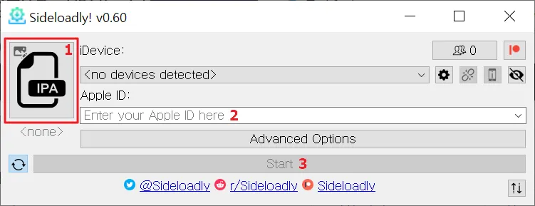 ◎ Sideloadly 실행하여 ①ipa 파일을 추가하고 ②Apple ID란에 애플계정(이메일형식) 입력 후 하단 ③Start 버튼을 클릭한다.