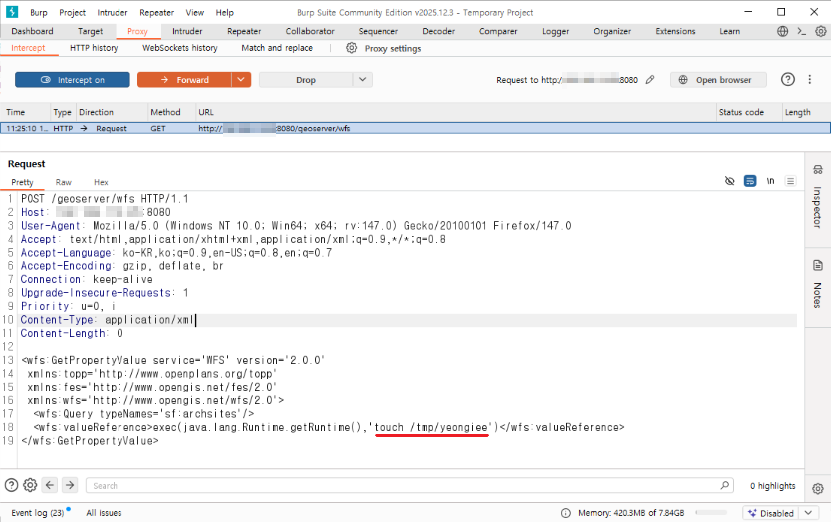 ◎ BurpSuite를 실행한 뒤 /geoserver/wfs 경로에 접근한다.