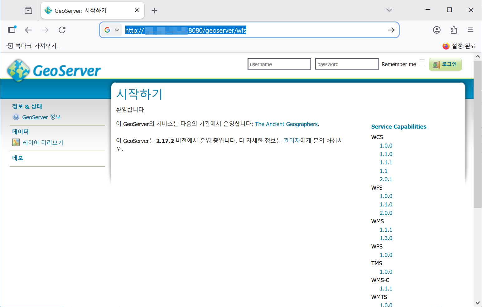 ◎ 브라우저에서 http://localhost:8080/geoserver/web 접속