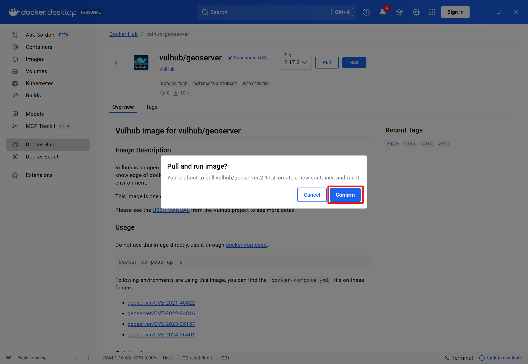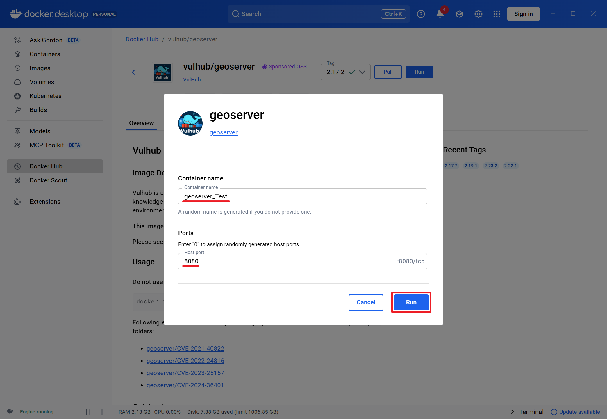 ◎ 도커 허브에서 취약한 GeoServer 환경 이미지를 다운로드 한다. (https://hub.docker.com/r/vulhub/geoserver)