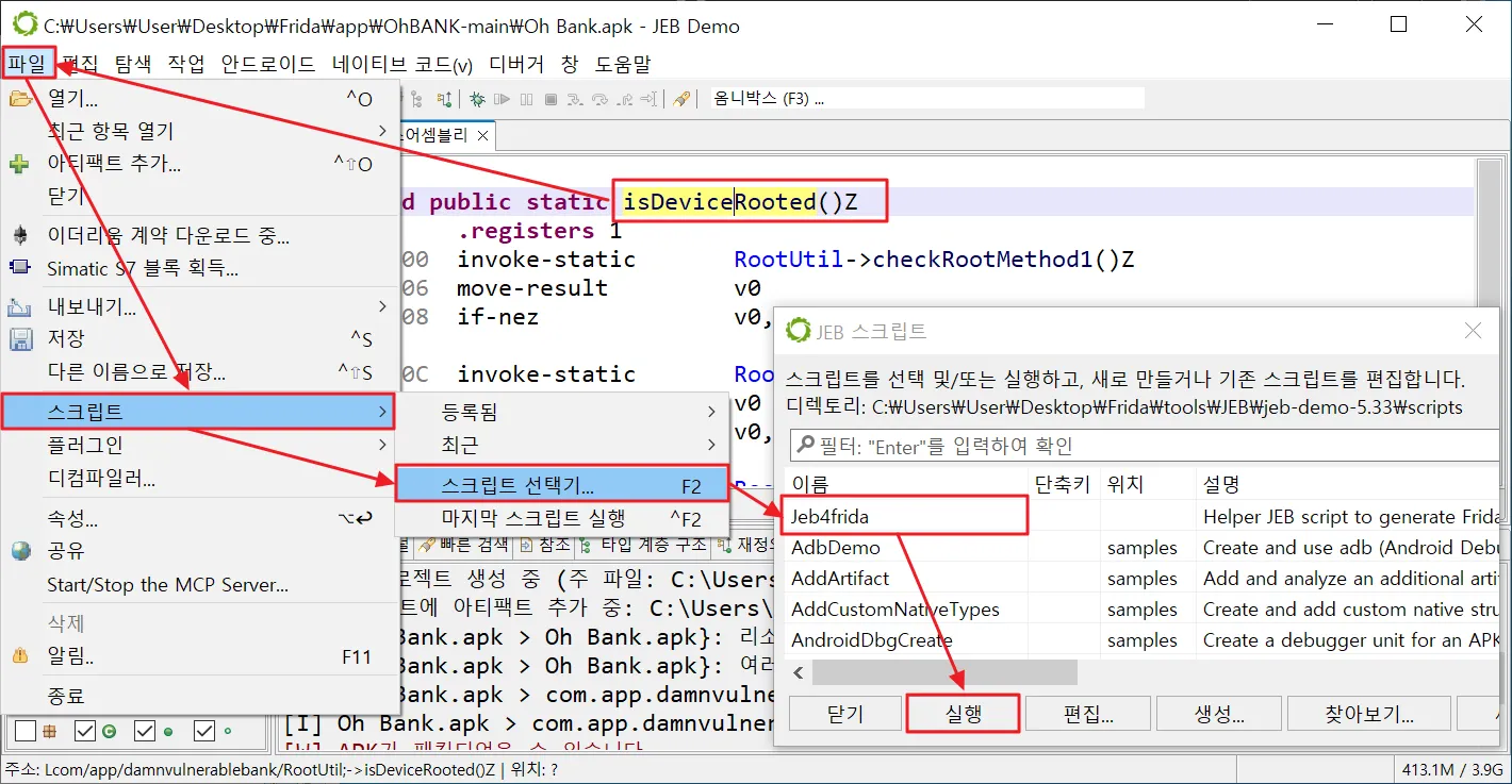 ◎ 루팅 탐지 코드에 커서 위치 후 파일 > 스크립트 > 스크립트 선택기 > Jeb4frida 실행