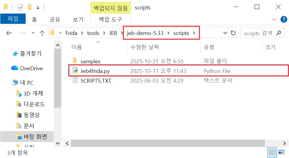 ◎ JEB에 Jeb4frida를 추가하기 위해, JEB 폴더 하위의 script 폴더에 Jeb4frida.py 파일을 이동한다.