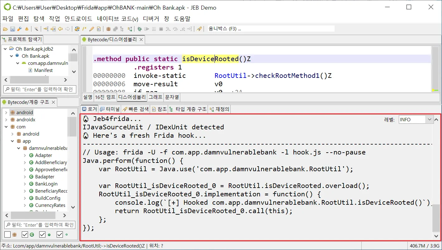 ◎ 제작한 후킹 코드를 실행한다. frida -U -f com.app.damnvulnerablebank -l hook.js