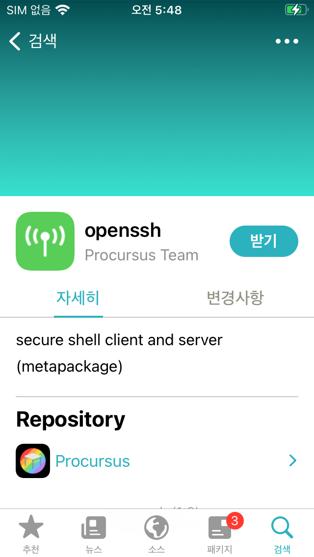8) 왼쪽 사진처럼 Sileo 어플 실행 후 SSH 검색하여 openssh 설치한다.