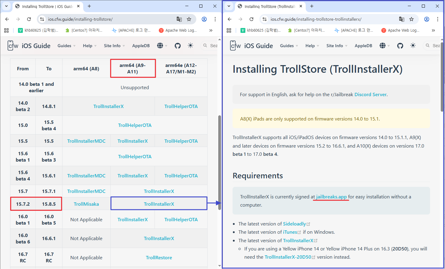 1) 탈옥 대상에 맞는 탈옥 도구를 확인한다. (https://ios.cfw.guide/installing-trollstore/)