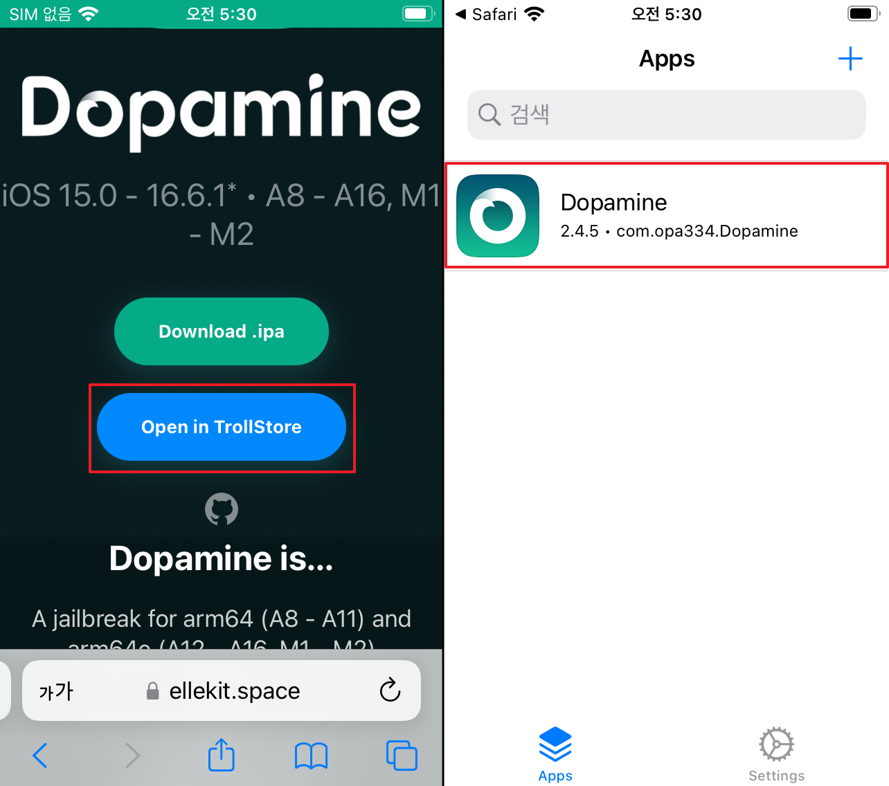 - Safari > 다운로드 링크 접속 > TrollInstallerX 클릭