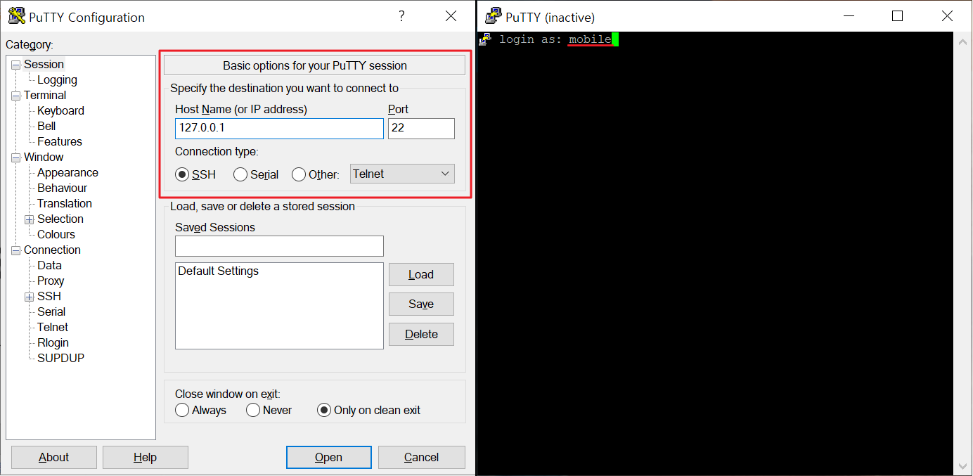 10) PC에서 PuTTy 프로그램을 실행하여 아이폰과 SSH 연결한다.