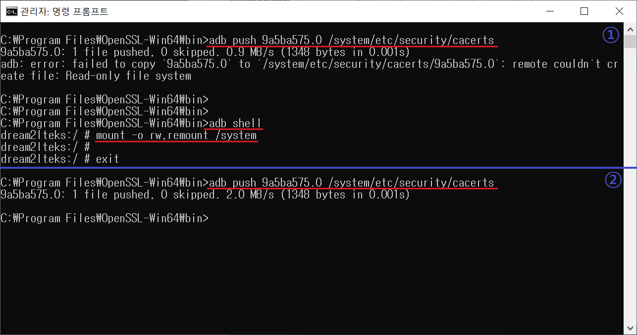 이때 디바이스 /system/etc/security/cacerts 경로에 권한이 있어야 저장이 가능하다. /system은 Android 시스템 파티션이며, 기본적으로 보안 및 안정성 때문에 ro(read-only) 권한으로 지정되어 있다. 따라서 인증서를 저장하기 전 /system 파티션을 읽기/쓰기 모드로 재마운트하여 권한을 먼저 변경해야 한다. 사진에 ①번 부분이 권한 변경 전 저장 시도하여 오류가 난 부분이다. 권한 변경 후에 저장하면 ②번 부분처럼 문제없이 저장이 가능하다.