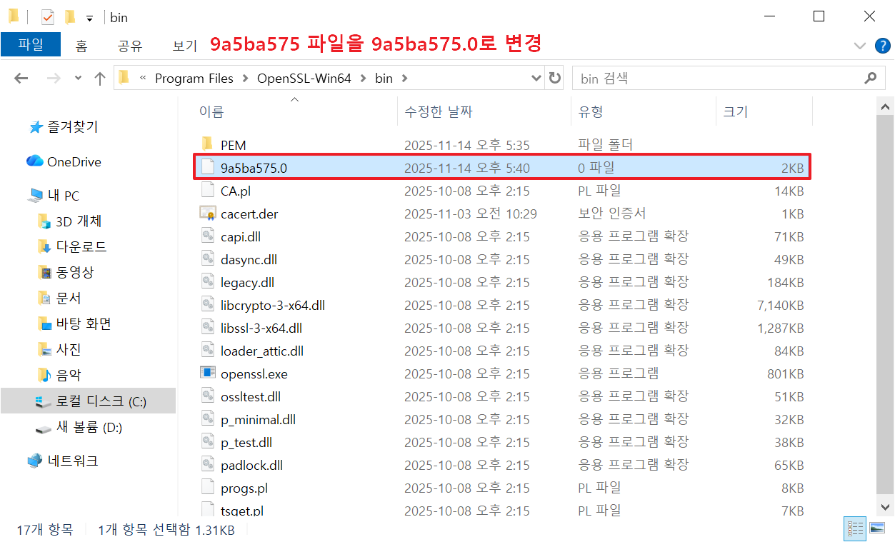 그렇다면 왜 변경하는 걸까? OpenSSL은 CA 인증서를 ‘해시값.번호’ 형태로 저장해야 인식이 가능하다. 9a5ba575는 인증서의 subject 이름을 해싱한 값이며, .0은 같은 해시를 가진 인증서 중 첫 번째(0번)이라는 의미이다. 보통 하나의 해시값에 인증서는 하나이기 때문에 .0을 사용한 것이다.