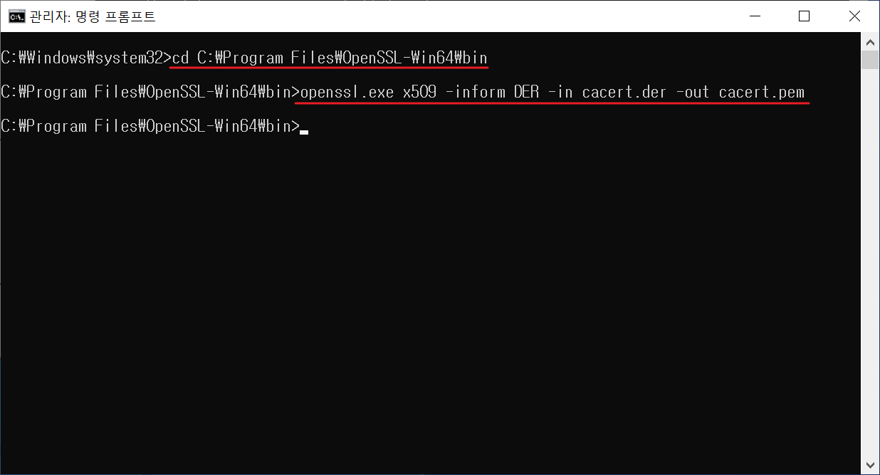 ◇ DER 형식의 X.509 인증서(cacert.der)를 PEM 형식(cacert.pem)으로 변환한다. DER는 바이너리 형식이고 PEM은 Base64 텍스트 형식이다. 대부분의 OpenSSL 명령이 PEM 형식을 요구하기 때문에 읽기·편집·도구 사용 용이성을 위해 PEM으로 변환한다.