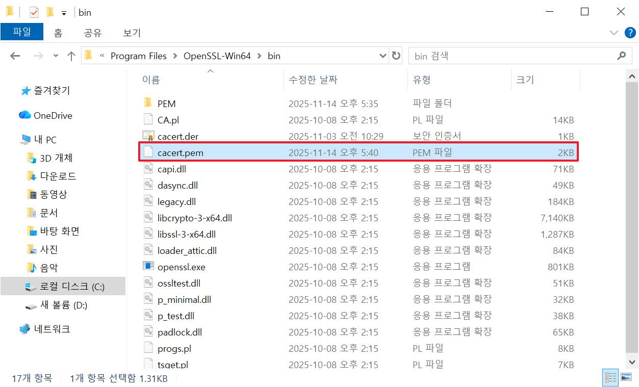 ◇ bin 하위 경로에 cacert.pem 파일이 생성된 것을 확인한다.