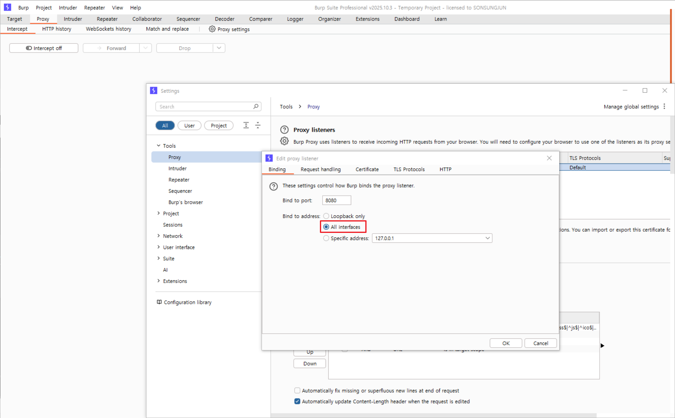 ◇ Burpsuite에서 All interfaces로 설정한다.